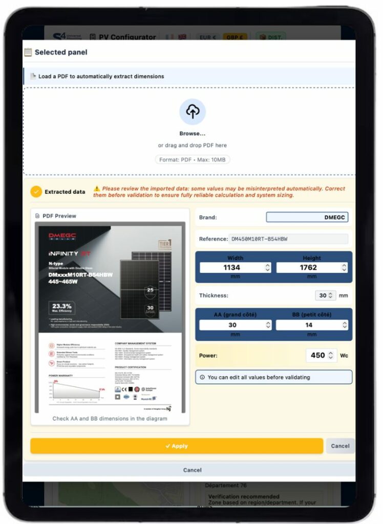 The configurator integrates a continuously updated library of over 2,000 photovoltaic module references, including: